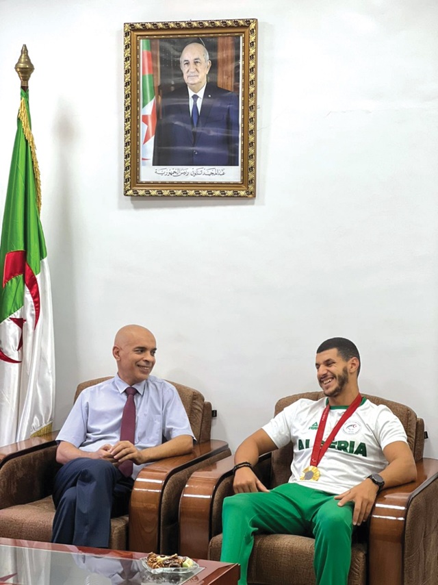 À son arrivée, Ibrahim Kandouz a été accueilli par Monsieur Mohamed Mouidi, Directeur Général de l’Office, ainsi que par les cadres centraux. Monsieur le Directeur Général lui a adressé ses félicitations pour son sacre à la médaille d’or lors des Jeux Paralympiques de Paris 2024, tout en saluant l’ensemble des athlètes médaillés de cette édition. Il a souligné que cet exploit reflète la détermination et la force des sportifs ayant pris part à cette compétition, illustrant ainsi la fierté et l’honneur des enfants de cette nation qui ont hissé haut les couleurs de l’Algérie sur la scène internationale.
